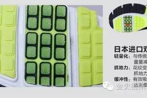 鞋底前掌部位采用DSP日本进口双层树脂材质,与传统的橡胶底相比,重量减轻了50%,轻而柔韧,抓地力更强,雨天更防滑。且可以有效吸收冲击力,达到最佳的缓冲效果。