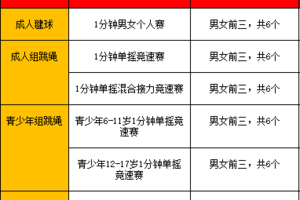 B1.成人组1分钟男女个人跳绳竞速赛:1分钟的时间内,单人跳绳次数,跳绳过程中可以停顿,以1 分钟结束时的总次数为个人最后成绩。最终以1分钟跳绳个数最多获胜。如果获奖的运动员所跳的个数相等,以跳绳中断最少的为获胜者。