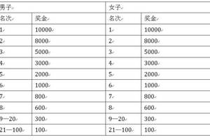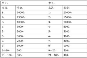 总成绩男子第1—100名的选手(按净计时成绩录取)、女子第1—100名的选手(按净计时成绩录取),分别获得奖金如下: